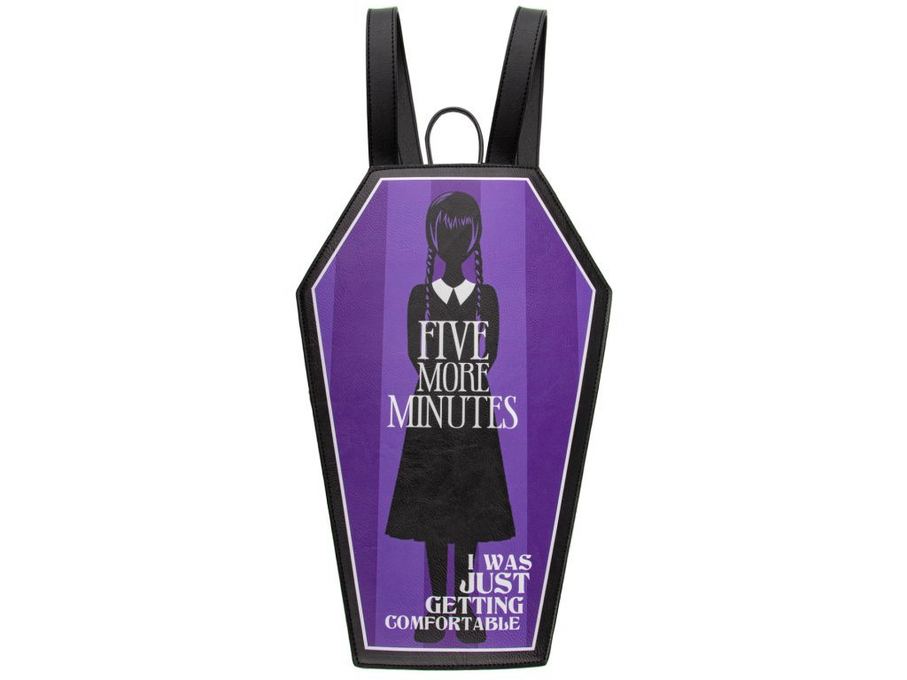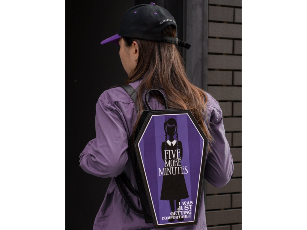 Náš batoh Coffin zobrazuje siluetu samotnej Wednesday Addamsovej, sprevádzanú jedným z jej ikonických citátov: „Ešte päť minút, práve som sa usadila.“