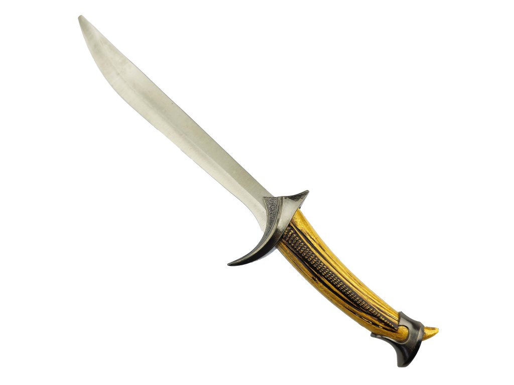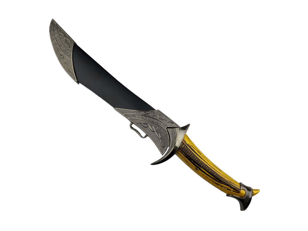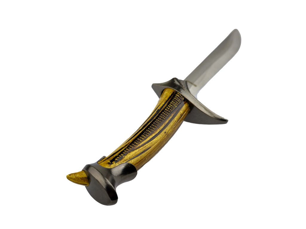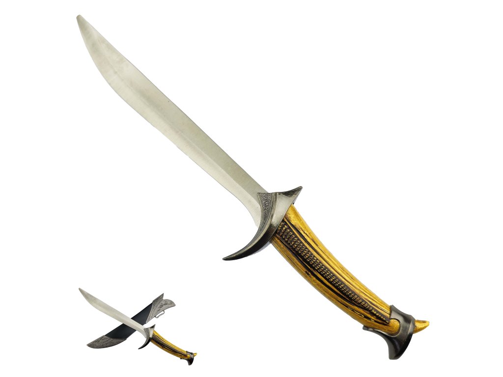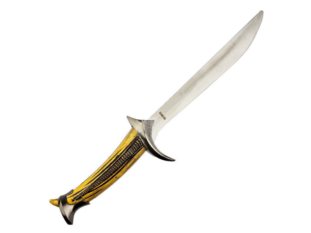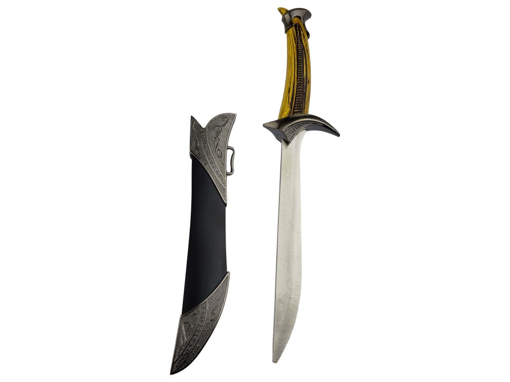 NEOSTRENÁ Dýka THORINA PAVÉZY "ORCRIST" HOBBIT REPLIKA Ďalší produkt zo sveta legendárneho príbehu z pera J.R.R. Tolkiena. Pán prsteňov patrí stále medzi najobľúbenejšie fantasy a my Vám teraz prinášame ďalšiu zmenšenú repliku a to konkrétne ORCRIST, ktorý užíval Thorin Pavéza. Dýka "ORCRIST" je svojim dizajnom 1:1 podobná svojej filmovej predlohe. Základom dýky je oceľ a celá dýka meria iba 27cm. samotná čepeľ meria od špice po záštitu 17 cm. Zahnutá záštita je svojimi ozdobnými detailmi vyvedená 1:1 s filmovým originálom. Súčasťou dýky je umelohmotná pošva, ktorá je na oboch svojich koncoch prekrytá kovovými prvkami. Dýka "ORCRIST" je nádherným výstavným kúskom, ktorý môžete využiť aj ako doplnok ku kostýmu, alebo na otváranie listov. "Tieto meče boli vykované v Gondoline. Vznešenými elfmi Prvého veku. Lepšiu čepeľ si nemožno priať!" Pri svojom putovaní sa skupina Thorina Pavézy stretla s trollmi v jaskyniach Rhudauru. Potom čo sa dostali zo zajatia týchto hrozivých trollov Thorin nachádza prastarú elfskú čepeľ Orcrist, ktorú vykovali dávni elfovia západu. Táto čepeľ je známa ako medzi elfmi, tak ale aj medzi škriatkami, ktorí jej nazývajú hryzač a veľmi sa jej obávajú. Thorin tento meč poňal za svoj a prisahal, že s touto čepeľou bude pobíjať škriatkov ďalej. S radosťou Vám predstavejeme čepeľ "ORCRIST".