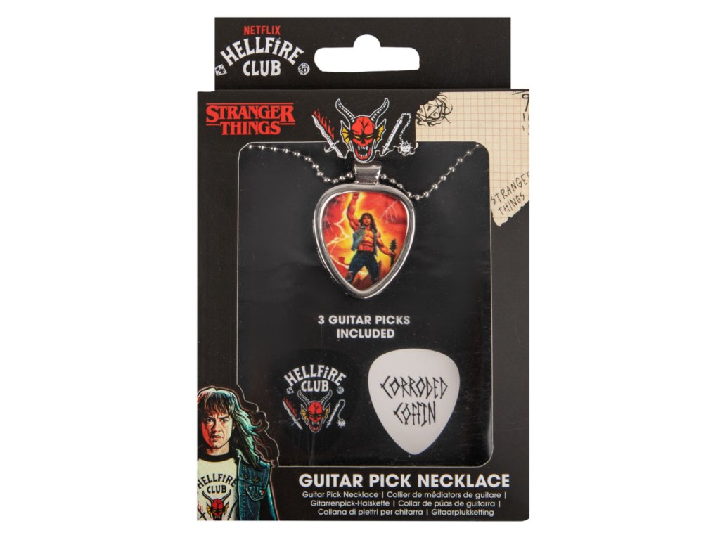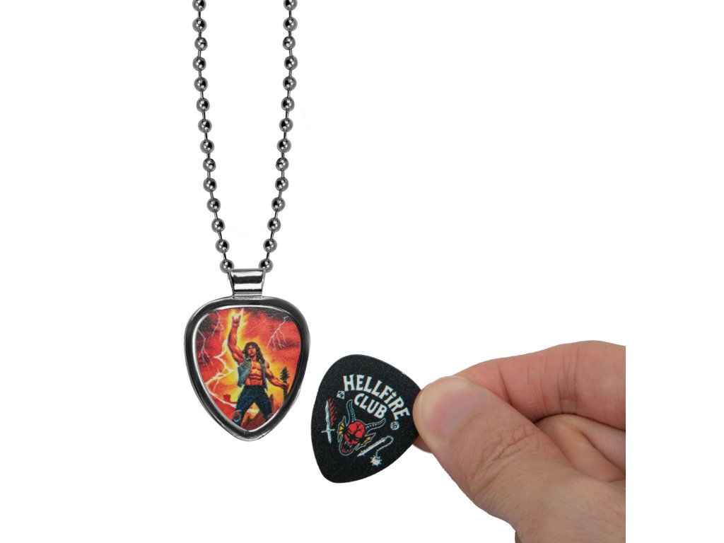 Ukážte svoju lásku k Hawkinsovmu obľúbenému metalistovi s naším exkluzívnym náhrdelníkom s trsátkami Eddie Munson! Tento jedinečný doplnok sa dodáva s tromi vymeniteľnými trsátkami, ktoré perfektne zapadajú do držiaka, takže si môžete kedykoľvek zmeniť svoj štýl.