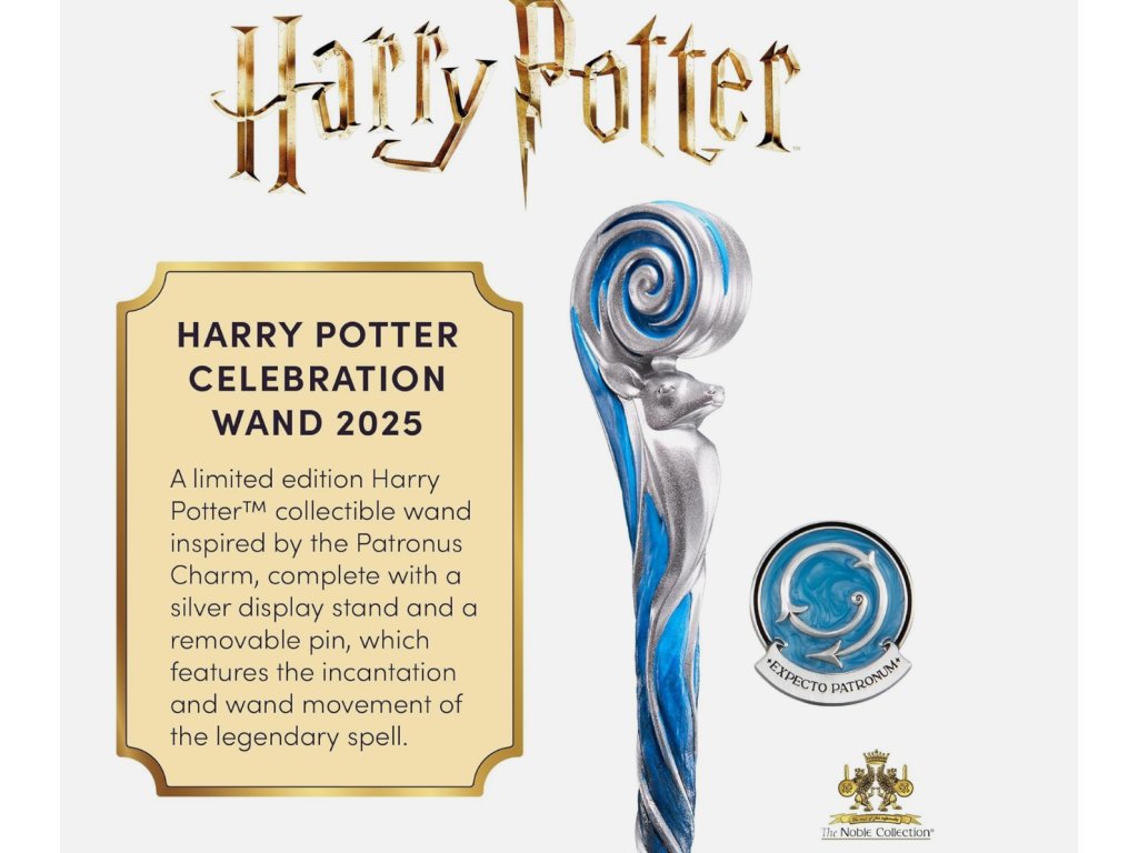 Oslavujte Harryho narodeniny s týmto exkluzívnym prútikom, inšpirovaným amuletom Patronus. Tento strieborno-modrý prútik zachytáva mystiku Harryho jeleňovho patróna, doplnený bustou jeleňa a špirálovým pohybom amuletu vytesaného do rukoväte. Tento prútik sa dodáva s odlievaným stojanom a zberateľským smaltovaným odznakom Patronus, ktorý si môžete vystaviť ako súčasť sady. Tento prútik, ktorý je k dispozícii len po obmedzenú dobu, z roku 2025 odštartuje uvedenie Harry Potter Celebration Wands od Noble Collection – začnite svoju novú kolekciu týchto jedinečných prútikov ešte dnes!
