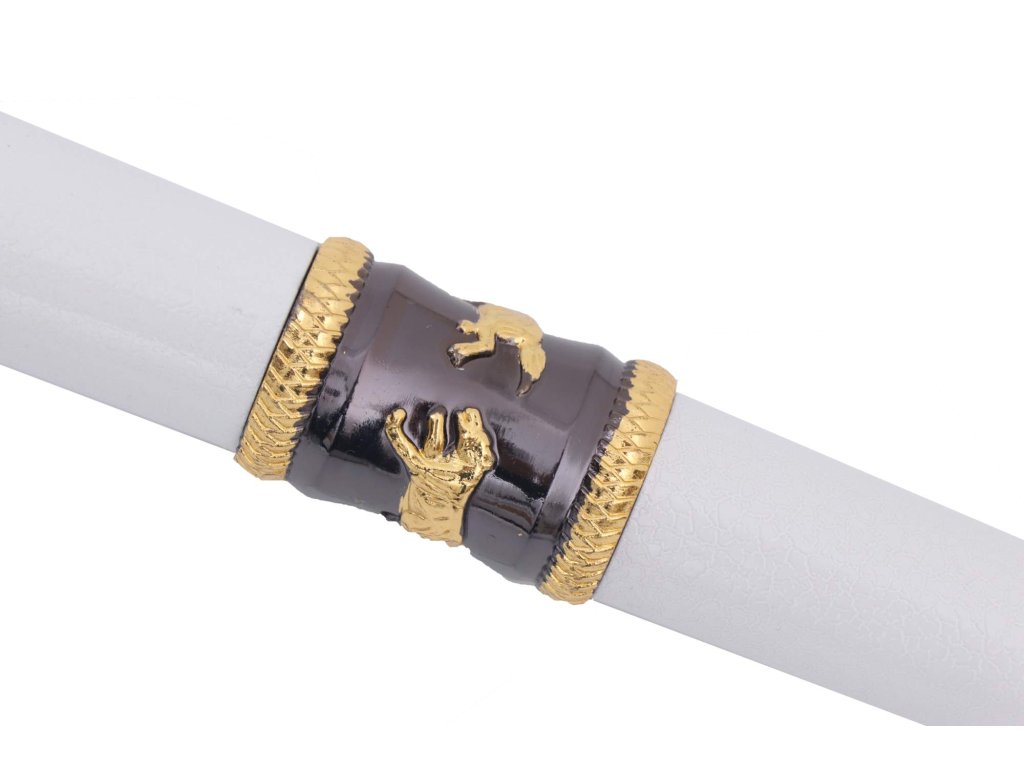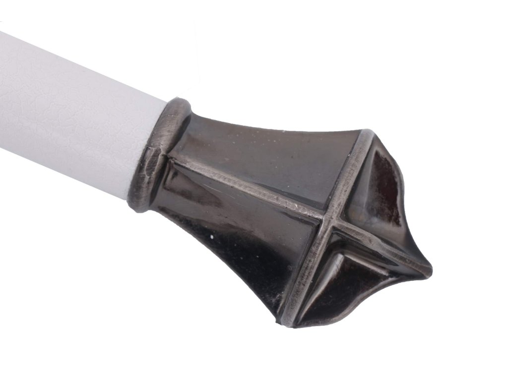 Rukoväť meča "EDDARD STARK" je veľmi krásne spracovaná v každom detaile. Tŕň prechádza celou dĺžkou dreveného jadra rukoväte, ktoré je potiahnuté bielou kožou. V strede rukoväte je potom zdobený motív s bežiacimi vlkmi. Záštita je rovnako ako hlavica tiež z nerezovej ocele na ktorej sú vyryté slová rodu Stark "Winter is coming".