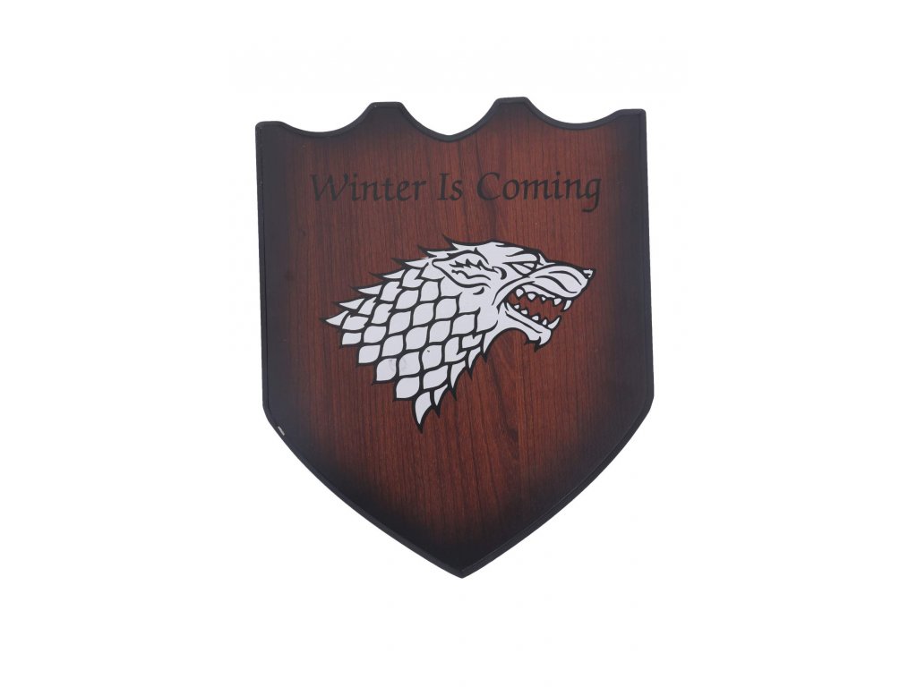 Súčasťou balenia tohto meča je aj vývesný štít s motívom zlovlka a rodovými slovami Starka.