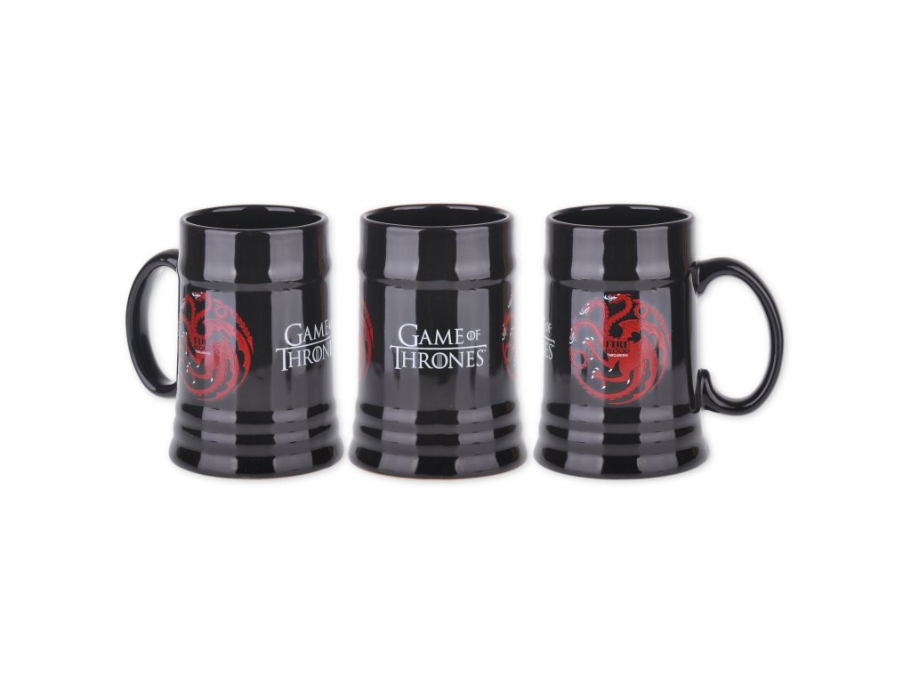 Čierny keramický korbel s logom fantasy série Game of Thrones - Hra o tróny a so znakom rodu Targaryen a nápisom Fire and Blood (Oheň a krv).Dodatočné parametre