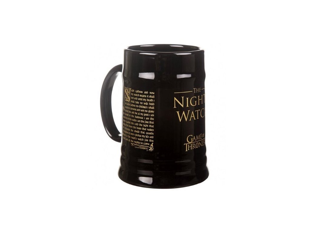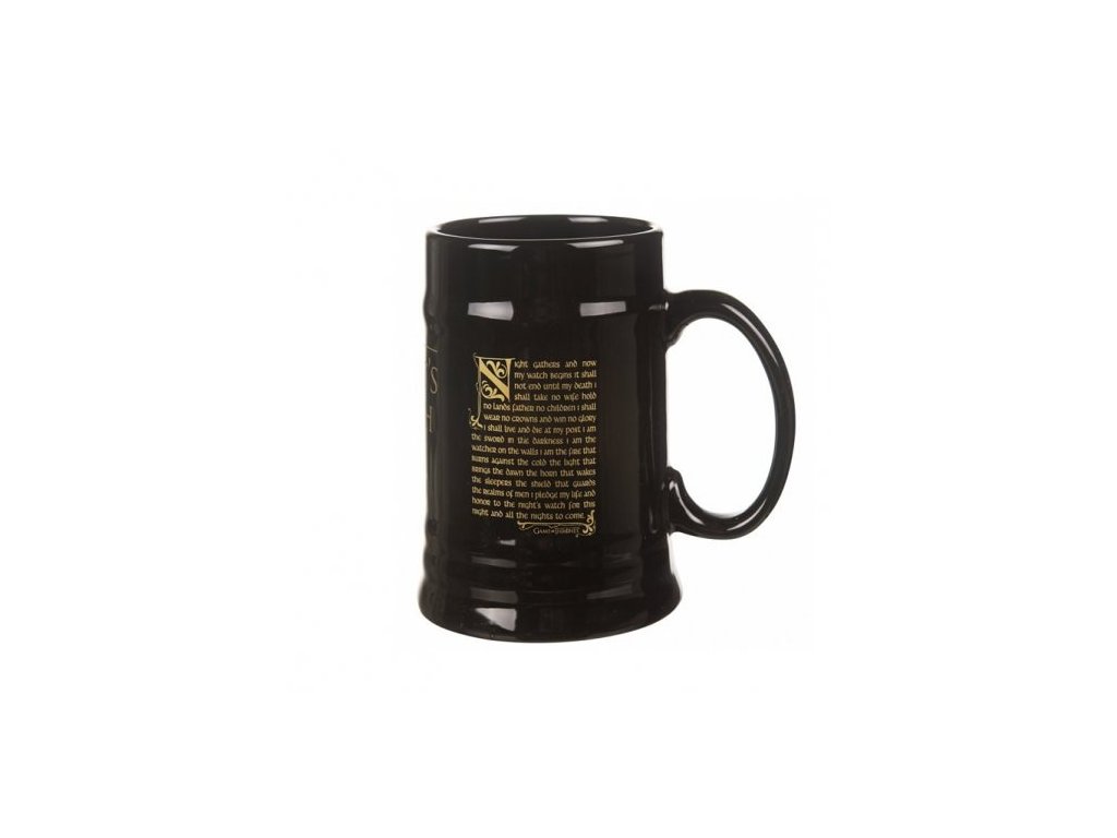 Čierny keramický korbel s logom obľúbeného fantasy seriálu Game of Thrones - Hra o tróny a s textom prísahy Nočnej hliadky.Dodatočné parametre