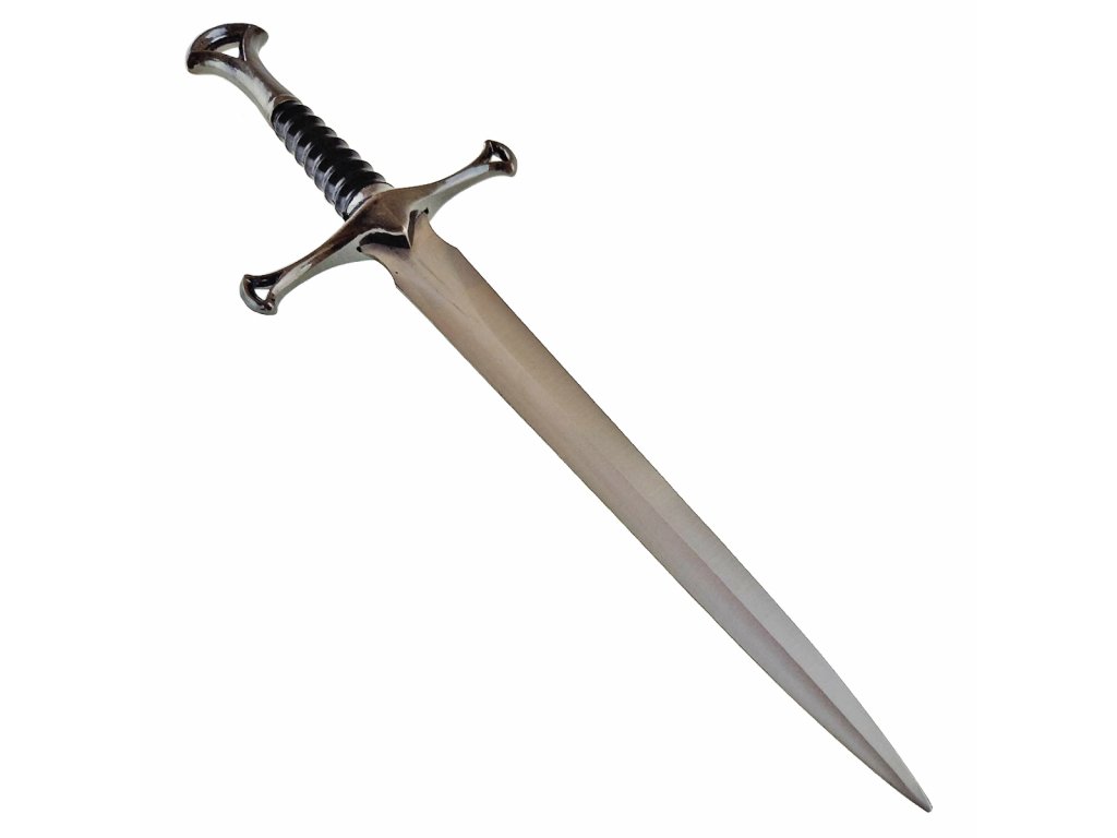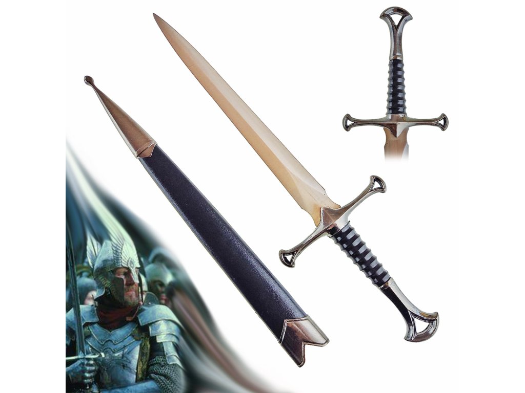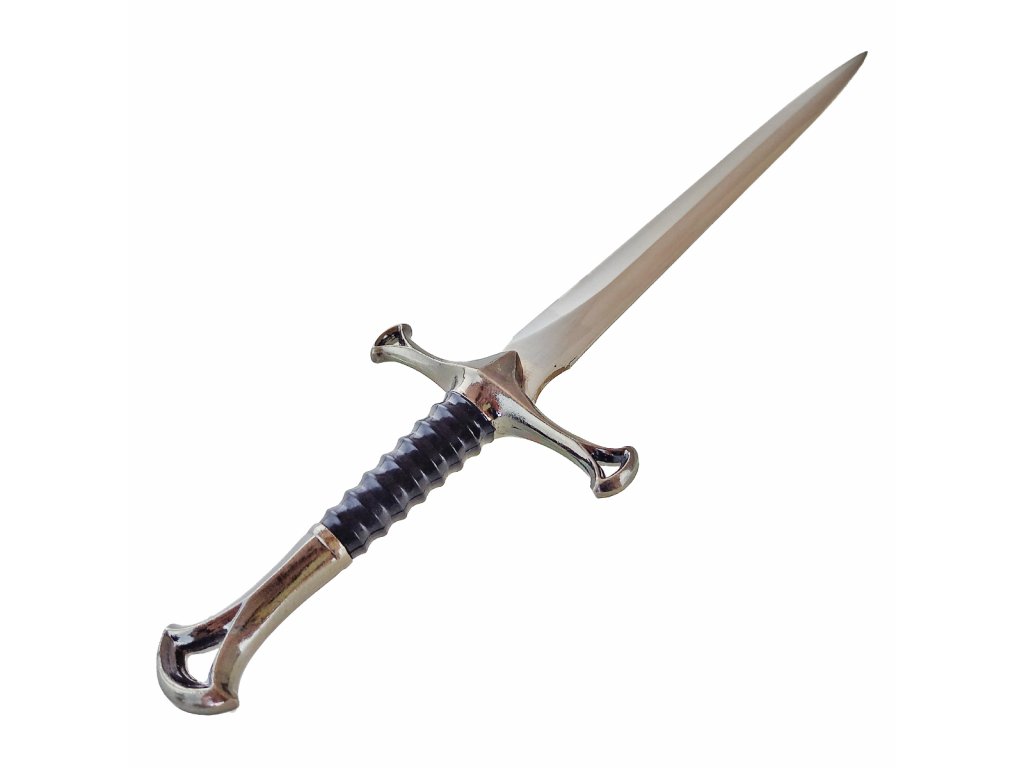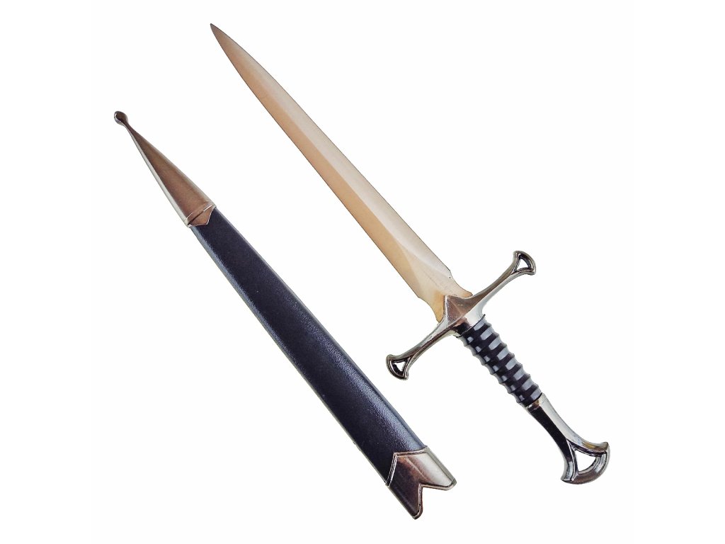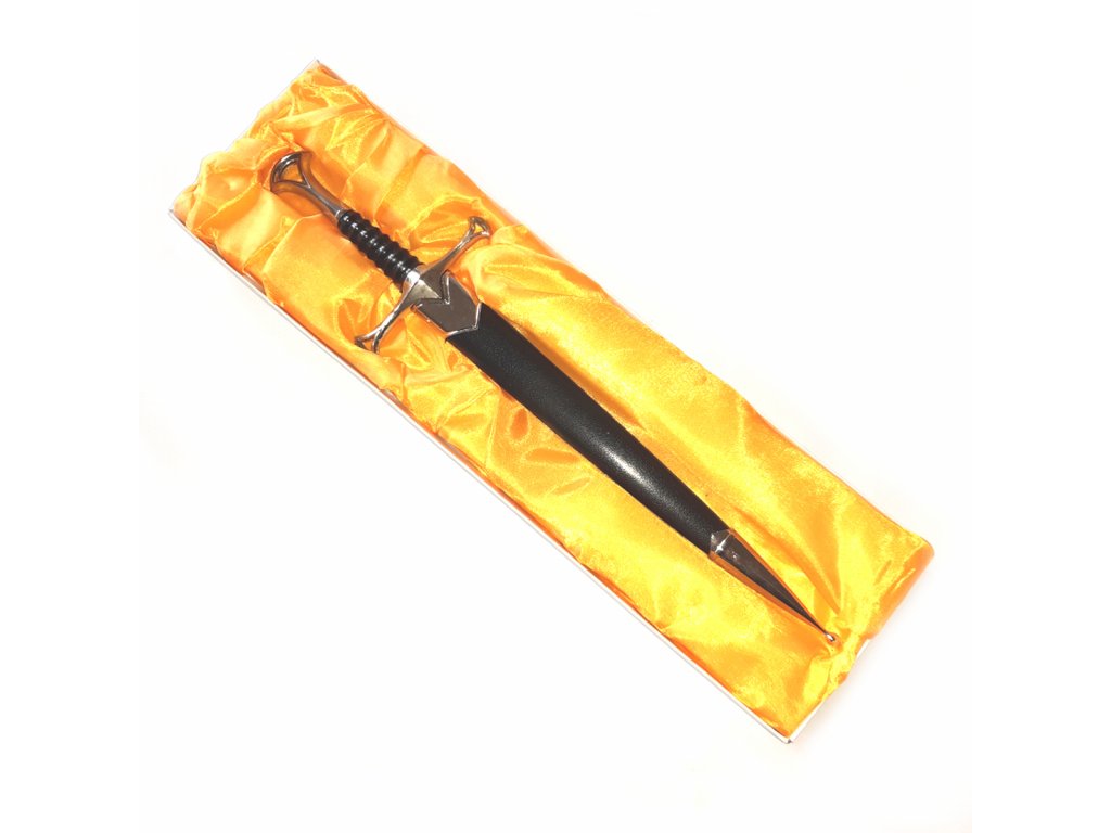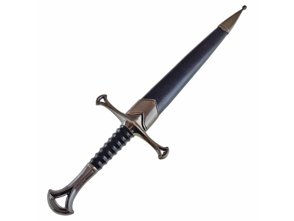 "Sauron iste nezabudol na Elendilov meč." Trilógia Pán prsteňov je medzi ľuďmi obľúbená a príbehy zo Stredozeme sa dotkli každého fanúšika žánru fantasy. A špeciálne pre Vás tu máme ďalší prírastok z kováčstva veľkých majstrov zbrojárov celej Stredozeme! Dýka "NARSIL" je nevyhnutným kúsok v zbierke každého fanúšika Lord of The Rings. Dizajnom sa dokonale podobá filmovej predlohe a zároveň jej väčšiemu bratovi, replike Aragornov meč "ANDURIL" PLAMEŇ ZÁPADU . Rukoväť dýky je tvorená z troch častí, záštita a hlavica sú tvorené z kovu, zatiaľ čo rukoväť z tvrdeného plastu. Padne ľahko do ruky, nešmýka a pohodlne sedí v ruke. Oceľová čepeľ, pevne zasadená v rukoväti, drží a nekýve sa. Čepeľ je tupá a neslúži k rezaniu či ku kontaktnému šermu. Na rozdiel od svojho staršieho brata, dýka nemá zdobenú čepeľ runami, ale tvarový dizajn je veľmi vydarený a na oko príjemný. K dýke patrí aj detailne spracovaná pošva tvorená z kovu a pevného plastu, ktorý je omotaný čiernou ekokožou. Dizajn pošvy je jednoduchý bez do očí bijúcich detailov krásne necháva dominovať krásu dýky. Dýka do pošvy padne ako uliata, drží pevne a samovoľne nevypadáva! :) Dýka "NARSIL" sa dokonale hodí ako doplnok ku kostýmu na stredoveké slávnosti, cosplay, divadelné predstavenia, alebo otváranie listov. Svojim dizajnom skvele zapadne do zbierky každého fanúšika LOTR.Dodatočné parametre