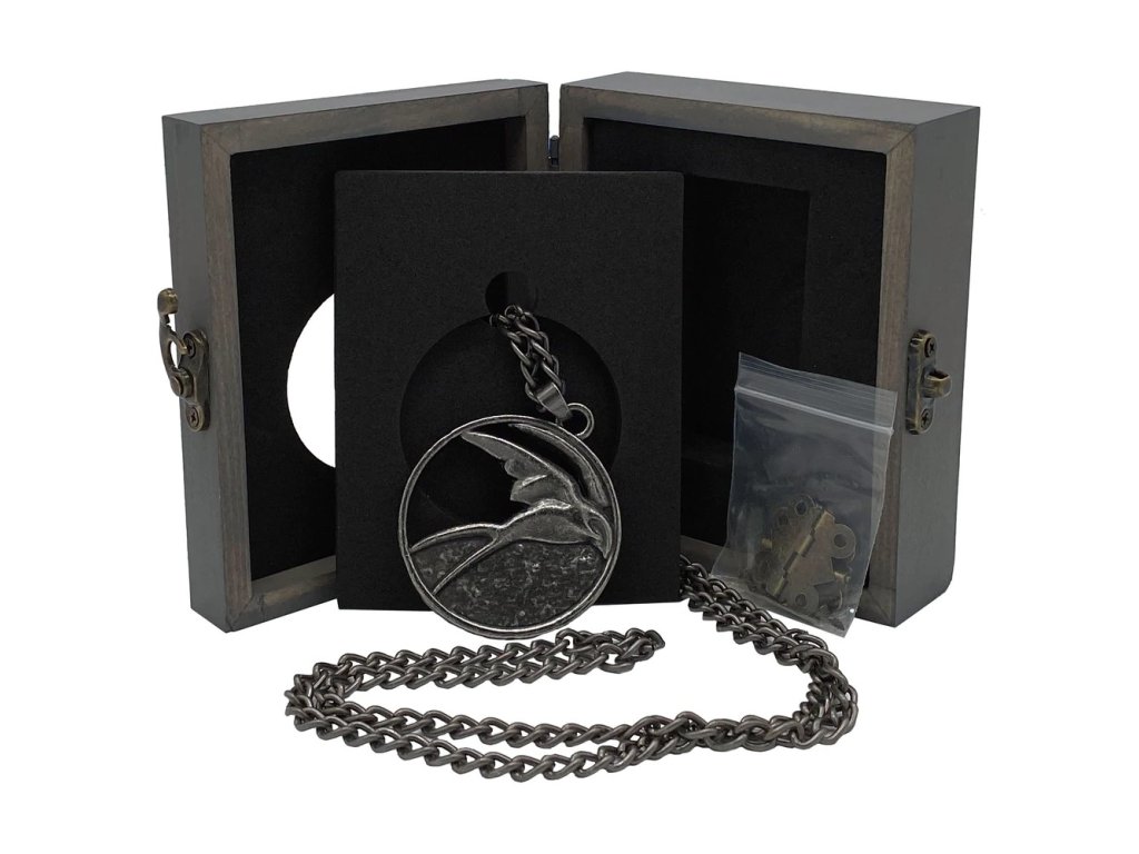 Medailón s lastovičkou, symbolom princeznej Ciri, Levíčaťa z Cintry, pristane všetkým fanúšikom seriálu Zaklínač od Netflixu! Kovový medailón má priemer 5 cm, súčasťou balenia je železná retiazka s dĺžkou 76 cm. Dodávané v zberateľskej drevenej krabičke.Dodatočné parametre