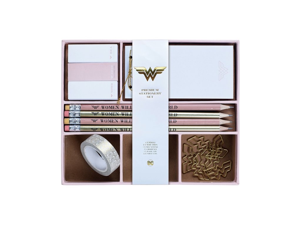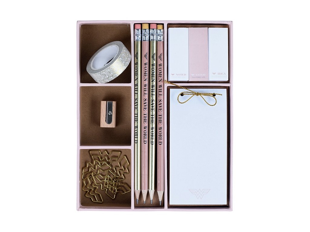 Táto jedinečná sada kancelárskych potrieb pre fanúšikov Wonder Woman obsahuje šesť rôznych užitočných pomôcok, či už na doma alebo do školy a práce. Obsah balenia: 6x kancelárska sponka 1x strúhadlo 3x blok samolepiacich štítkov 1x mini zápisník 1x lepiaca páska 4x ceruzkaDodatočné parametre