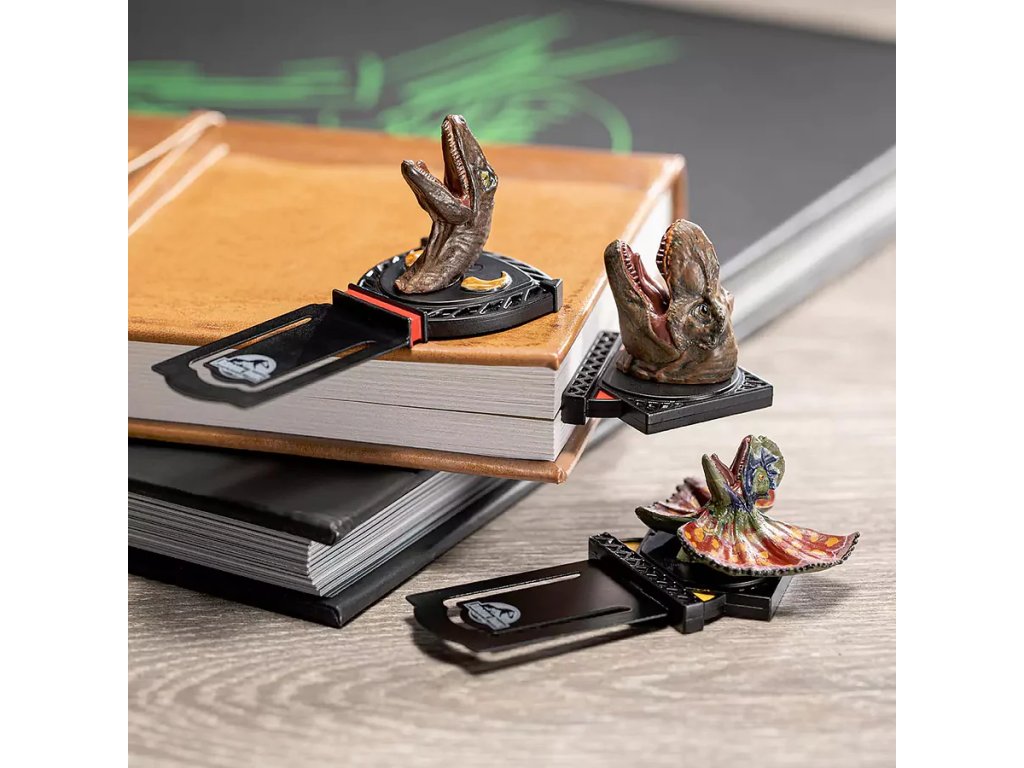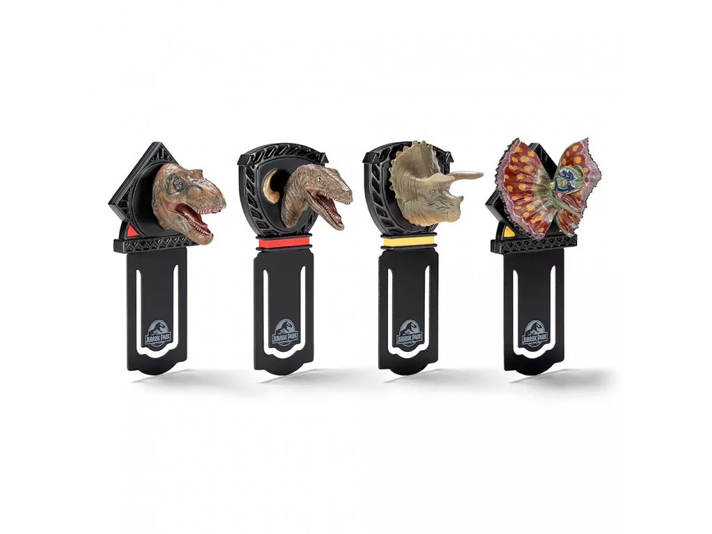 Sada krásnych 4 knižných záložiek do knihy v podobe dinosaurov Tyrannosaura Rexa, Velociraptora, Dilophosaura a Triceratopsa bude skvelým darčekom pre malých aj veľkých fanúšikov Jurského parku (Jurassic Park).