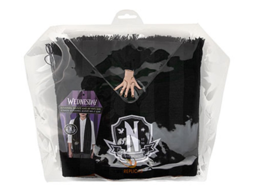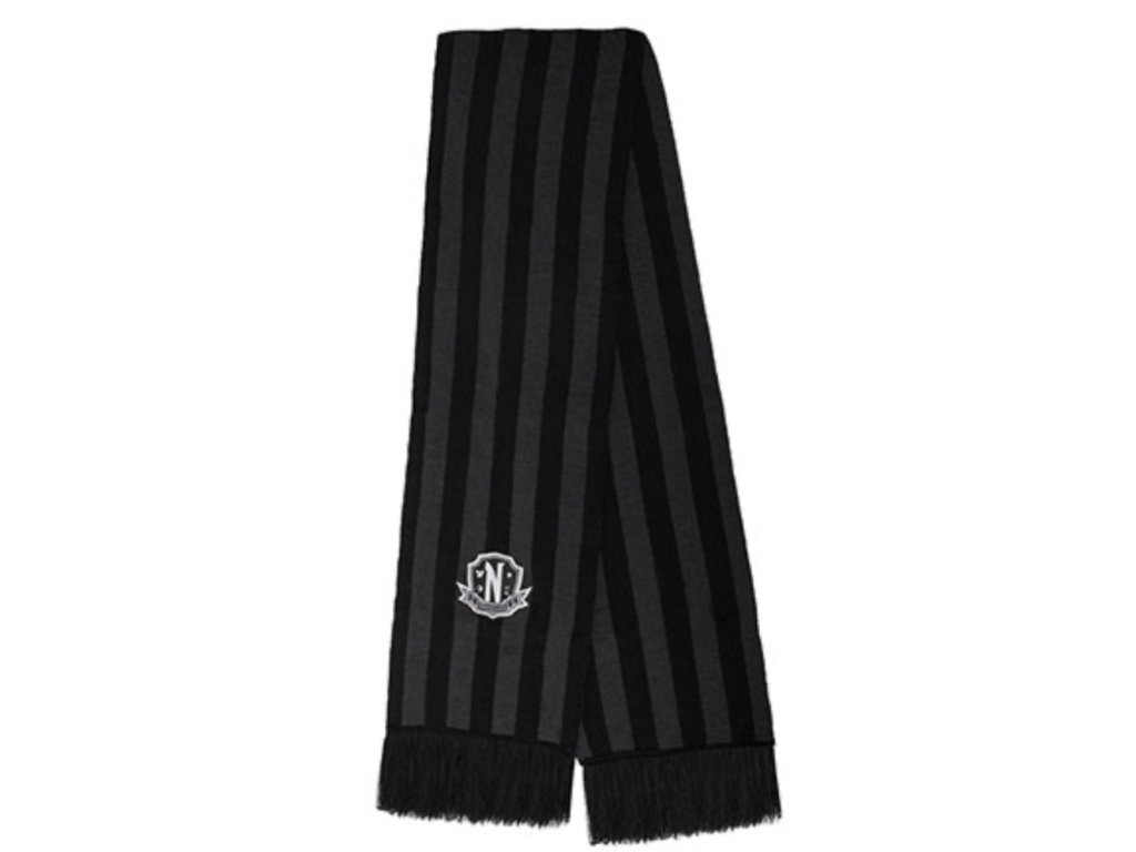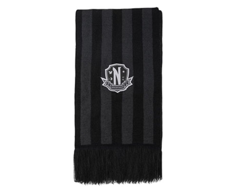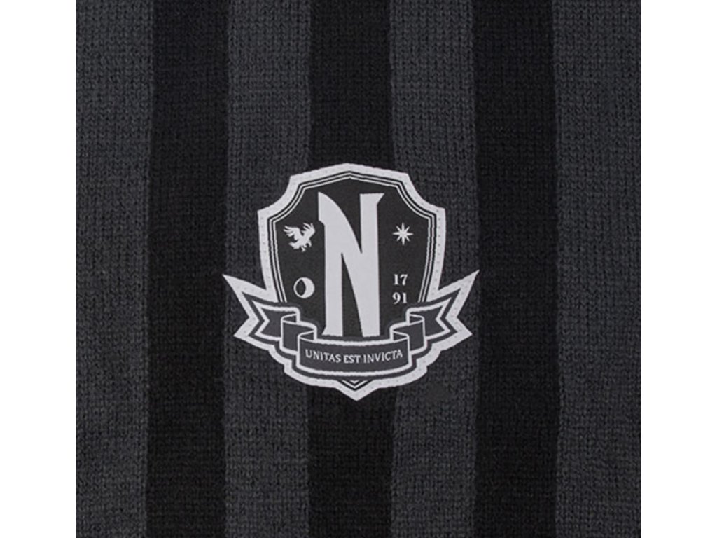 Nádherný 180cm dlhý čierny šál so znakom Nevermore Academy zo seriálu Wednesday vám pristane! Jedinečný doplnok vášho oblečenia či kostýmu!