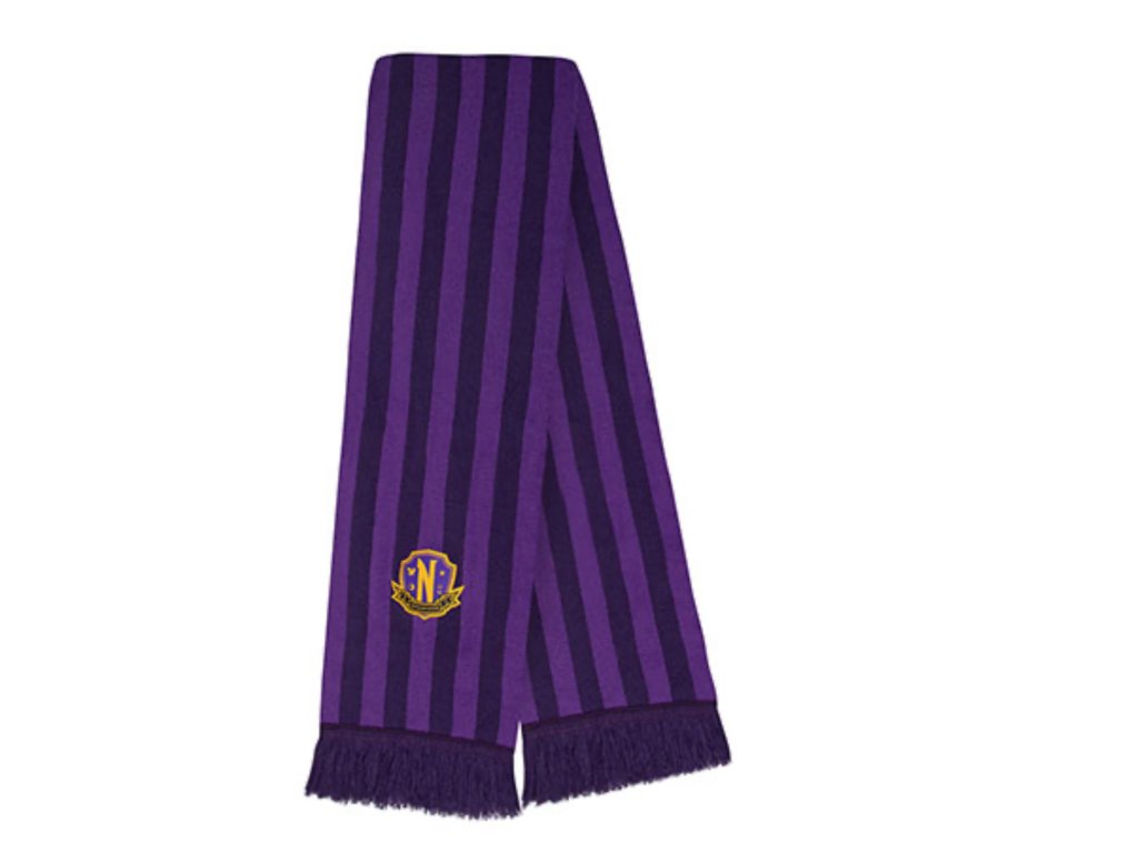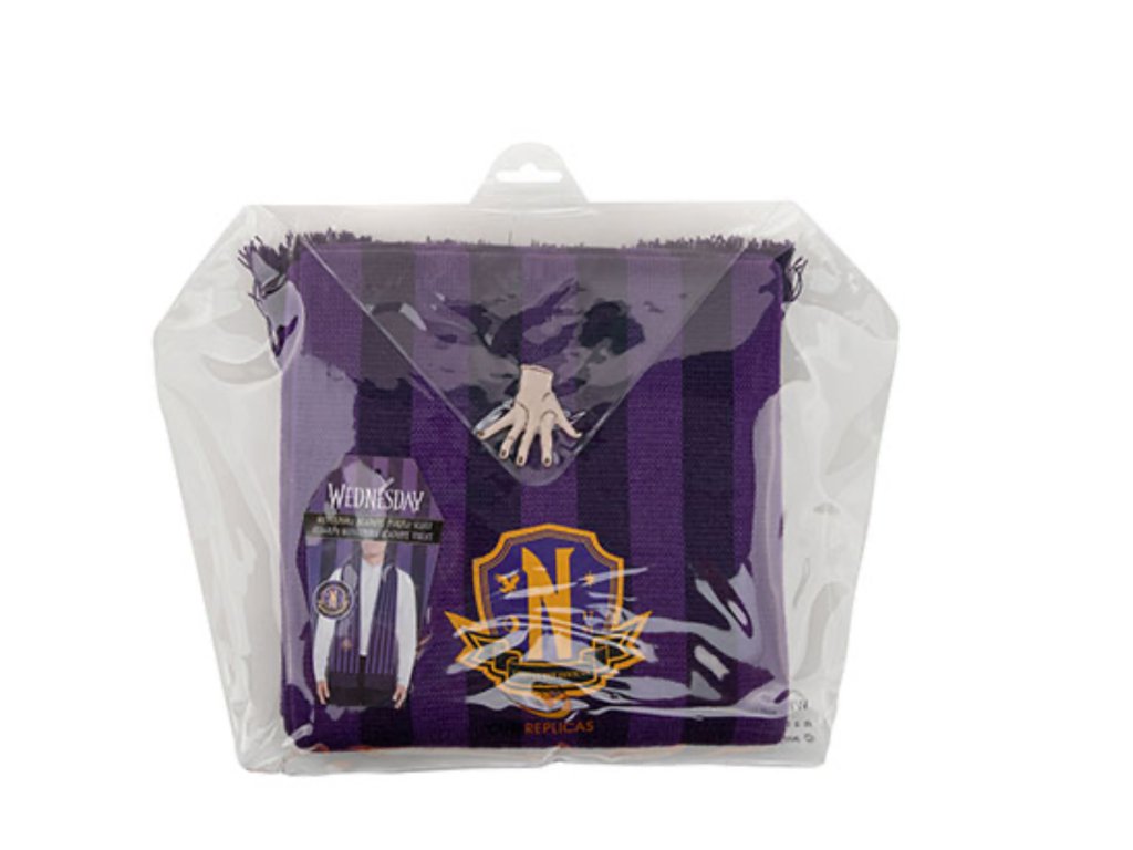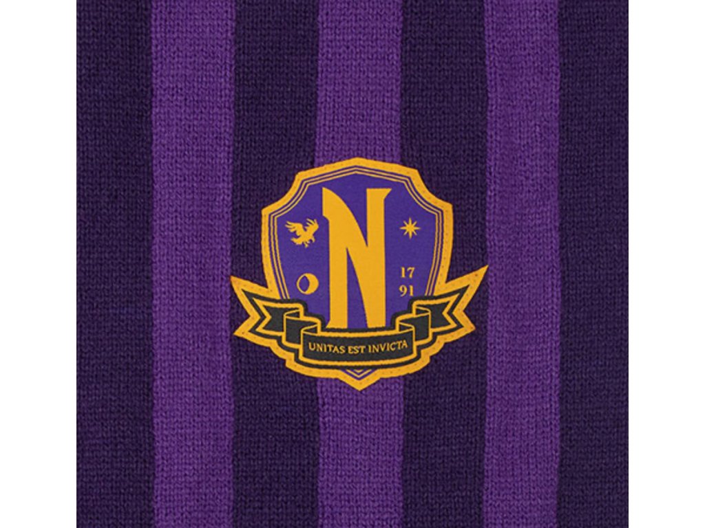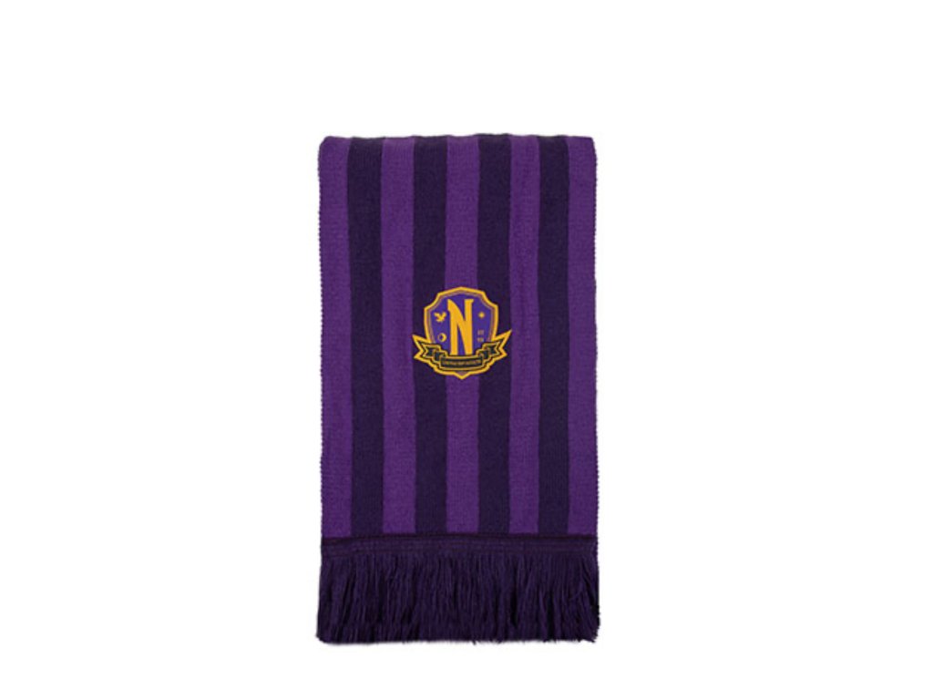 Nádherný 180cm dlhý fialový šál so znakom Nevermore Academy zo seriálu Wednesday vám pristane! Jedinečný doplnok vášho oblečenia či kostýmu!