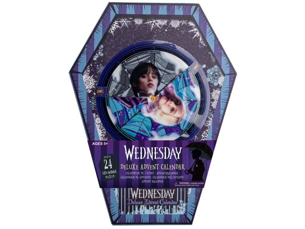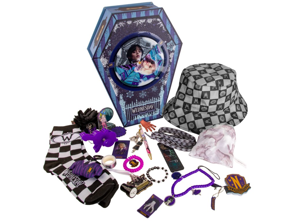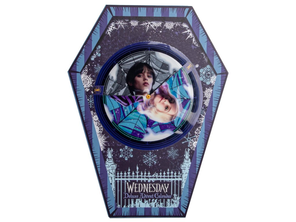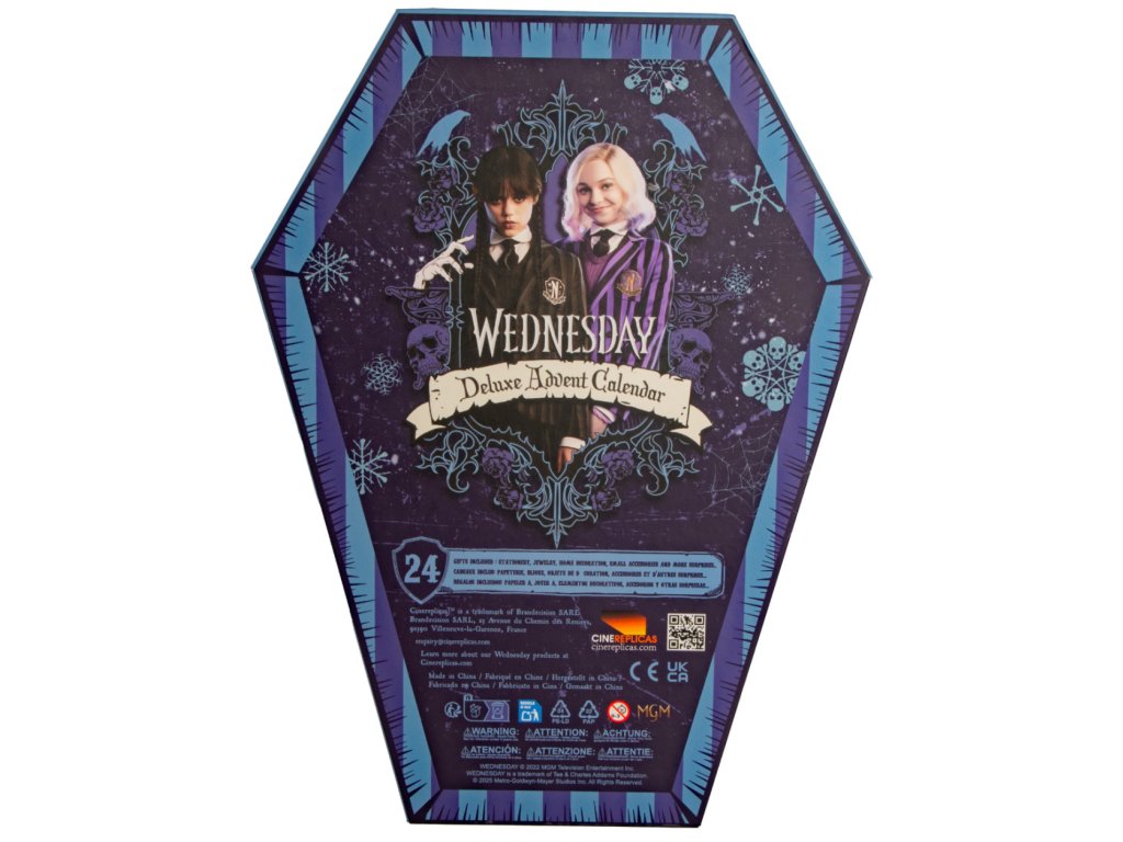 V unikátne vyrobenej krabičke v tvare rakvy obsahuje Wednesday Deluxe adventný kalendár 24 prémiových darčekov inšpirovaných temným štýlom Wednesday Addams.