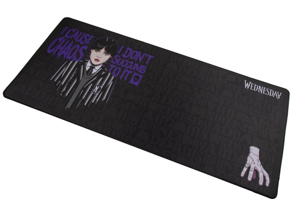 Okolo jej obrazu sa nachádzajú výrazné fialové textové vyhlásenia: „Spôsobujem chaos“ a „Nepodľahnem mu“, ktoré dokonale vyjadrujú Wednesdayinu kontrolovanú a asertívnu povahu. Rozsiahly čierny povrch je zvýraznený mrazivým obrázkom Veci, ktorý podložku efektívne premieňa na makabrózny manifest pre váš pracovný priestor.